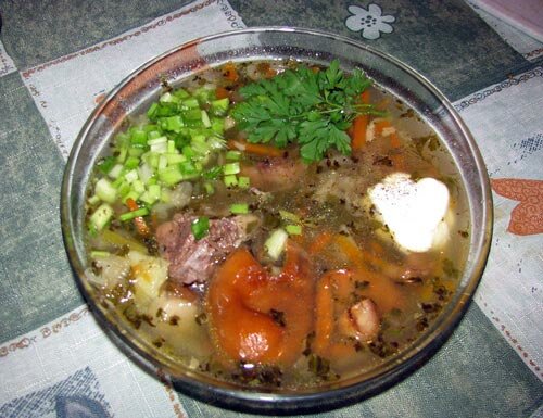 Сначала отваривают бульон с кореньями и луком, потом добавляют овощи и кислую заправу. Кстати, кислую капусту варили отдельно от мясного бульона и только потом добавляли. Пряности следует класть в конце варки.